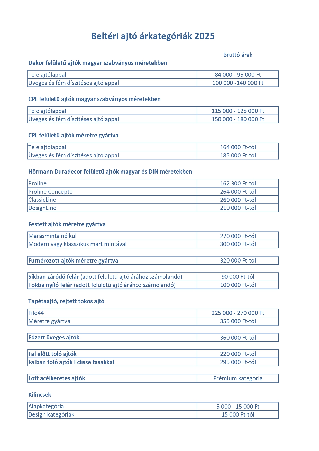 Az alábbiakban a beltéri ajtók tájékoztató árlistáját talája.